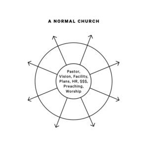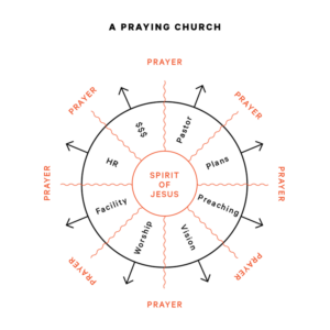 Every element in this chart is important and good. The arrows on the outside show how the church is reaching into the broader world with mission. At the core of the church are important ingredients: the pastor, preaching, plans, worship, and so on. Each item helps make a successful church. The one oddity is how weak prayer is. I’ve represented this by graying out “prayer.” Here is a more biblical blueprint: